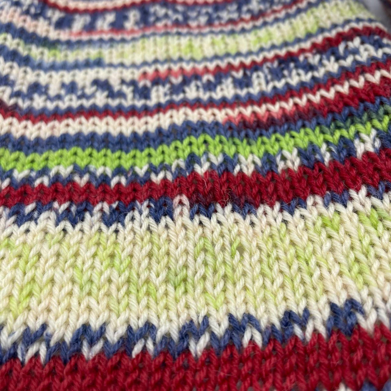 Рисунок с эффектом жаккарда. Нить окрашена секционно так, что при вязании лицевой гладью формируется сложный норвежский или жаккардовый узор без необходимости менять нити.