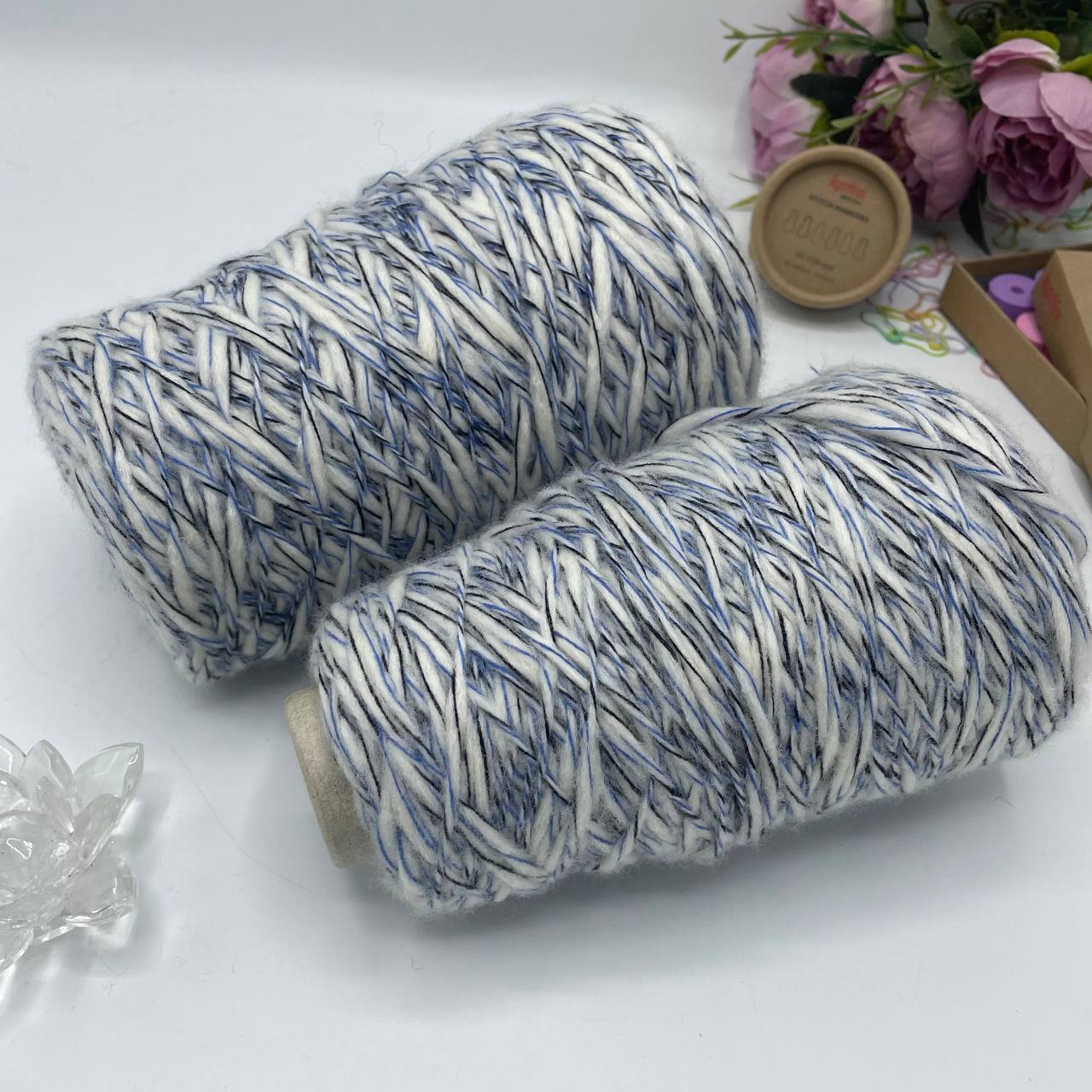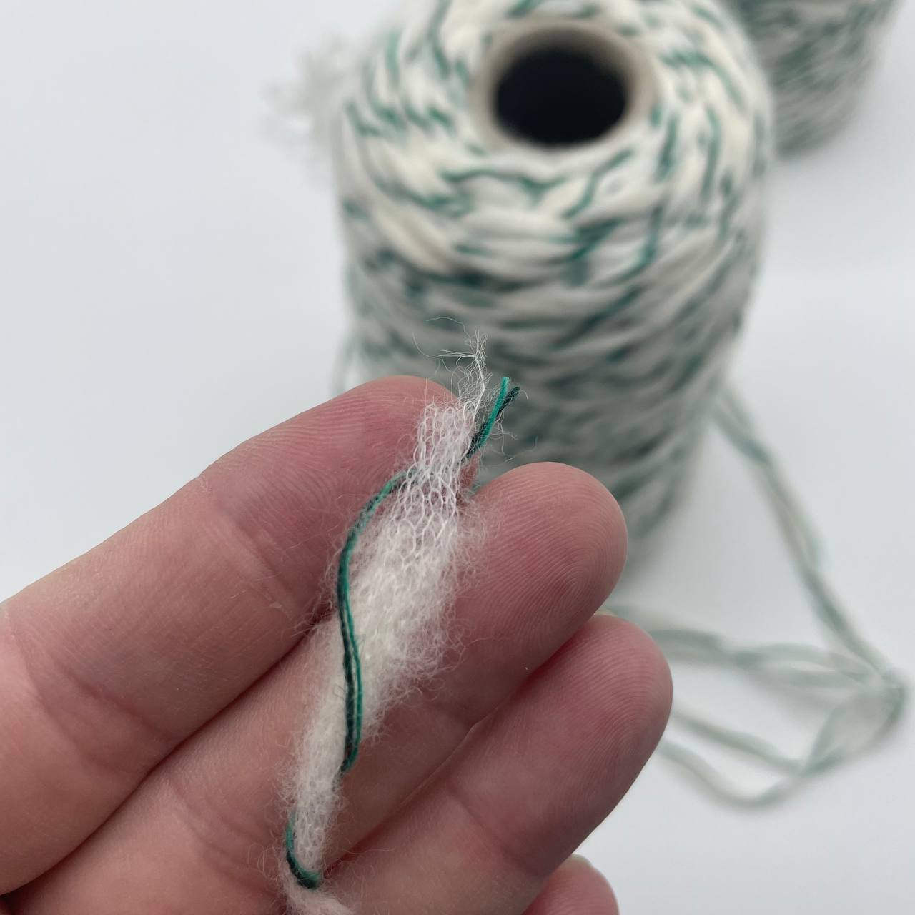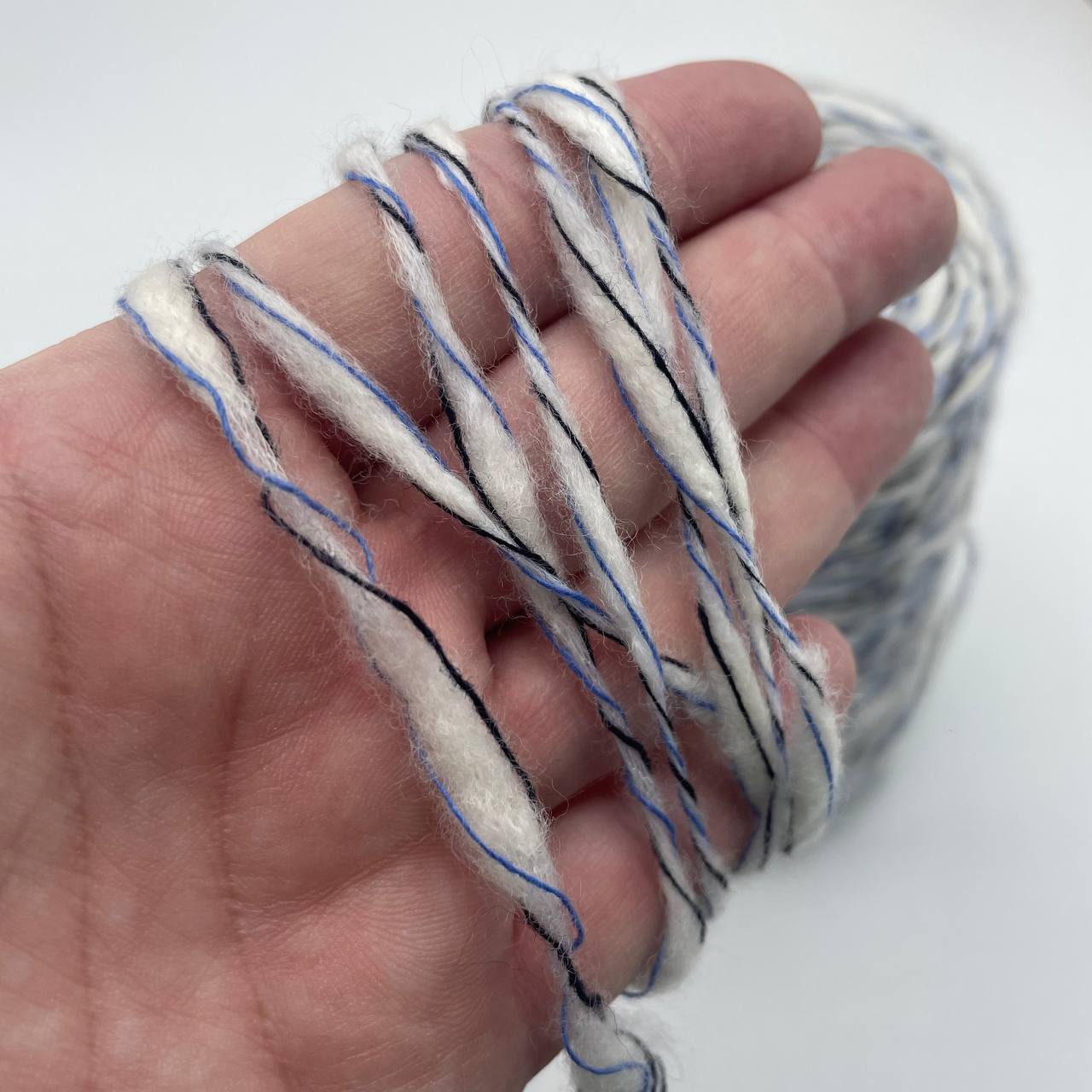ТОЧНЫЙ СОСТАВ НЕ ИЗВЕСТЕН. По ощущениям очень мягкий меринос. Тонкий шнурочек наполнен пухом и обвит хлопковой нитью.