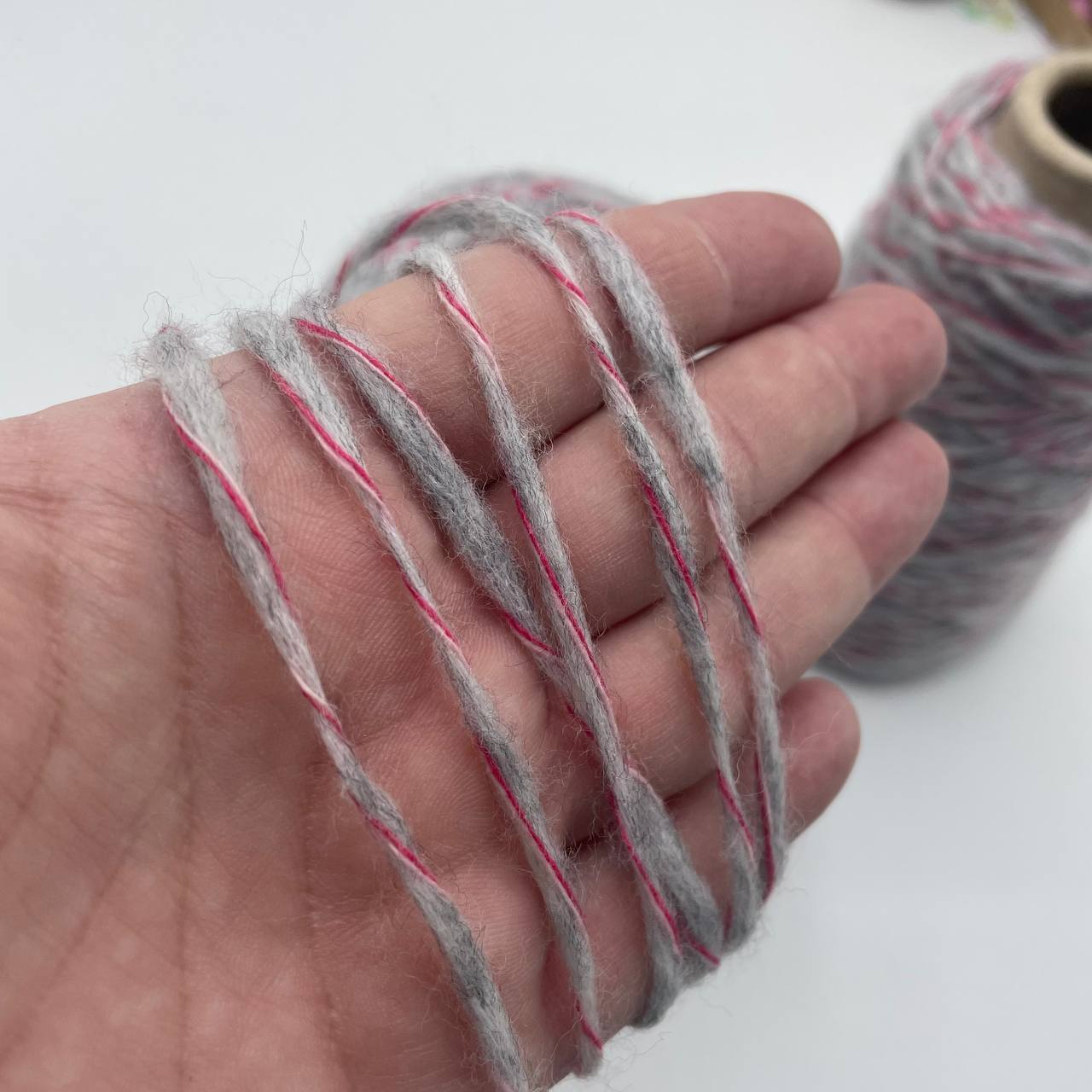 ТОЧНЫЙ СОСТАВ НЕ ИЗВЕСТЕН. По ощущениям очень мягкий меринос. Тонкий шнурочек наполнен пухом и обвит хлопковой нитью.