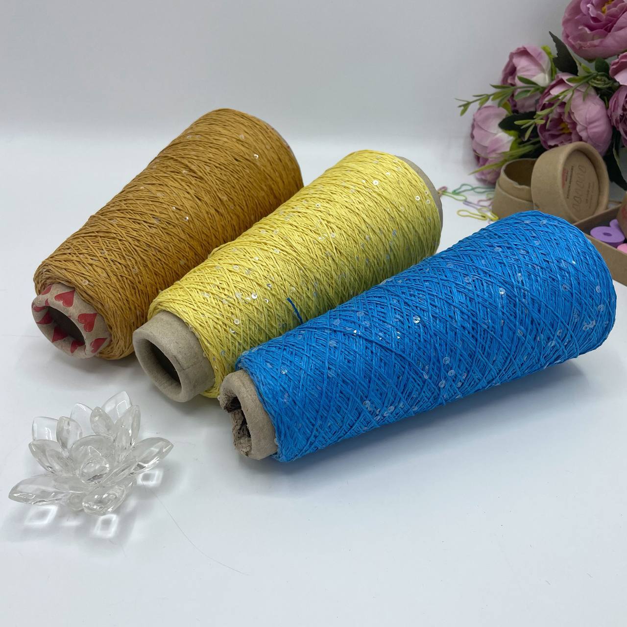 Нить хлопка обвита тонкой полиамидной нитью с нанизанными на нее пайетками, 7 см друг от друга. В пайетках кроется красивый блеск и переливы. Пайетки мягкие и пластичные,  не раздражают кожу. Нить идеально подойдет как дополнение к основной пряже, а так же как самостоятельная.