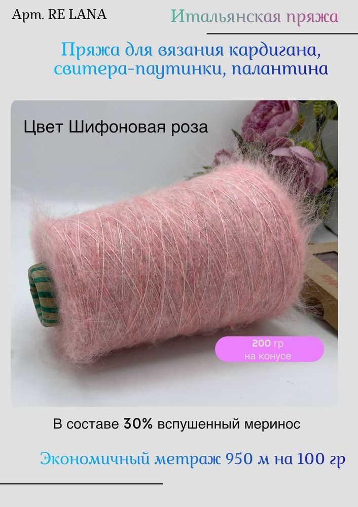 Очень мягкая текстура нити приятно ощущается на коже, что делает ее идеальной для создания свитера паутинки, уютного кардигана или невесомого палантина, который станет настоящим украшением вашего гардероба.