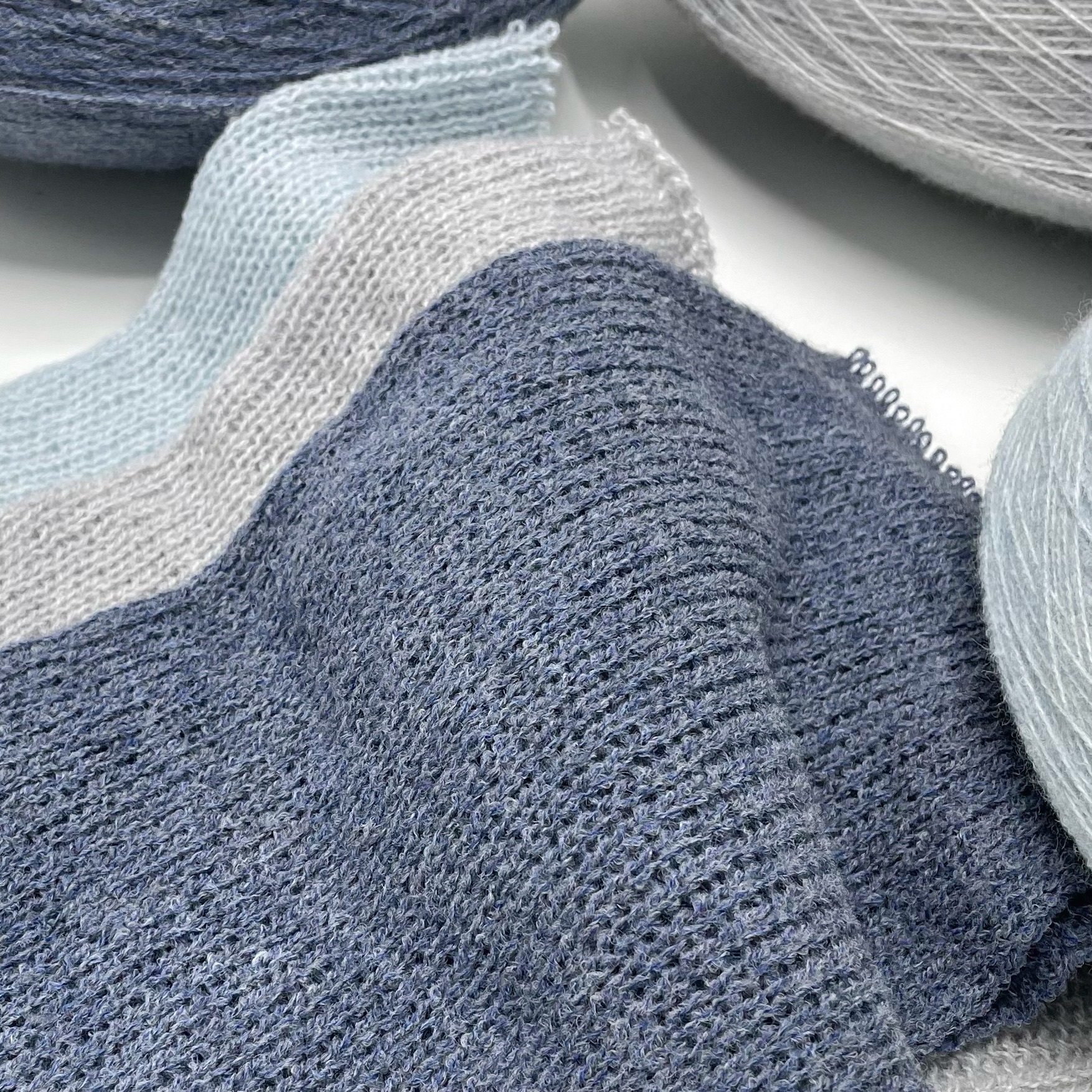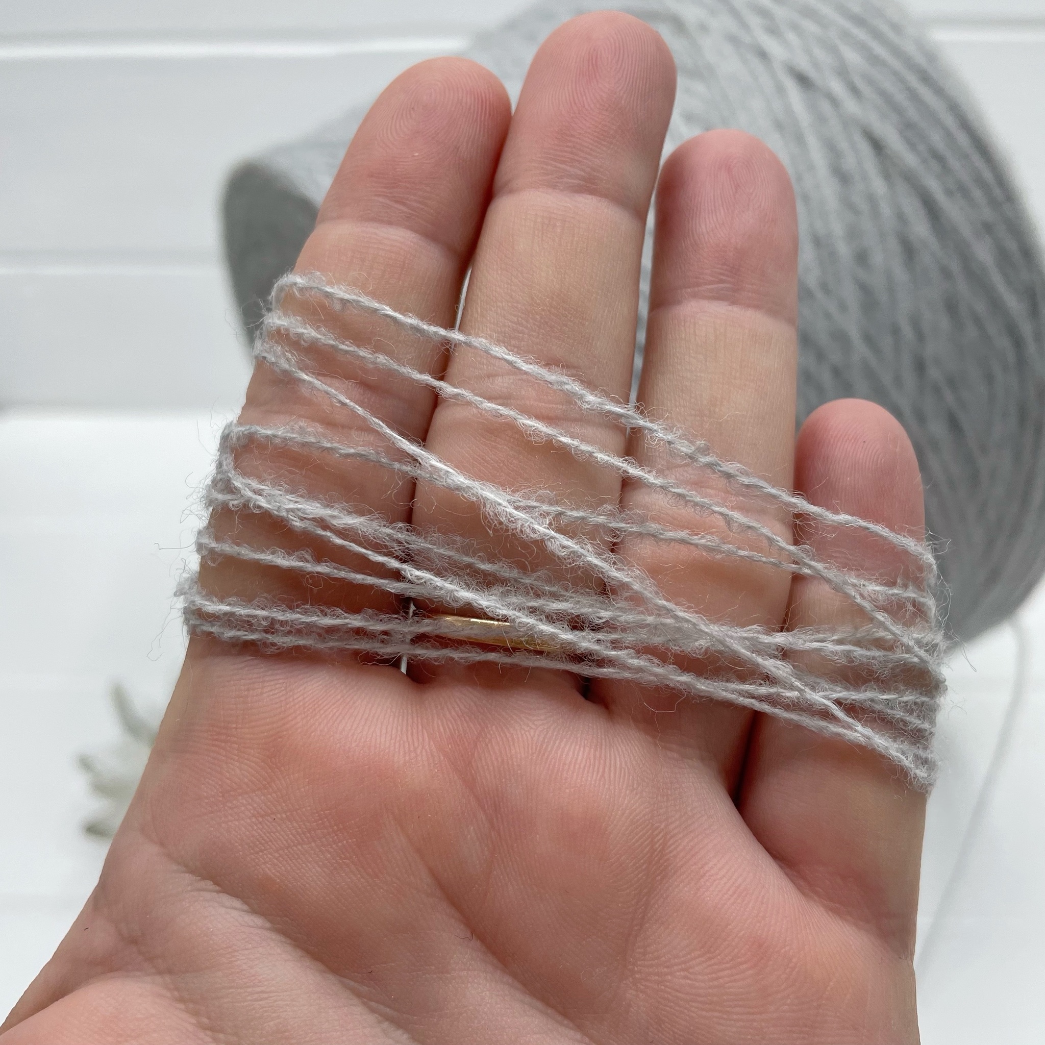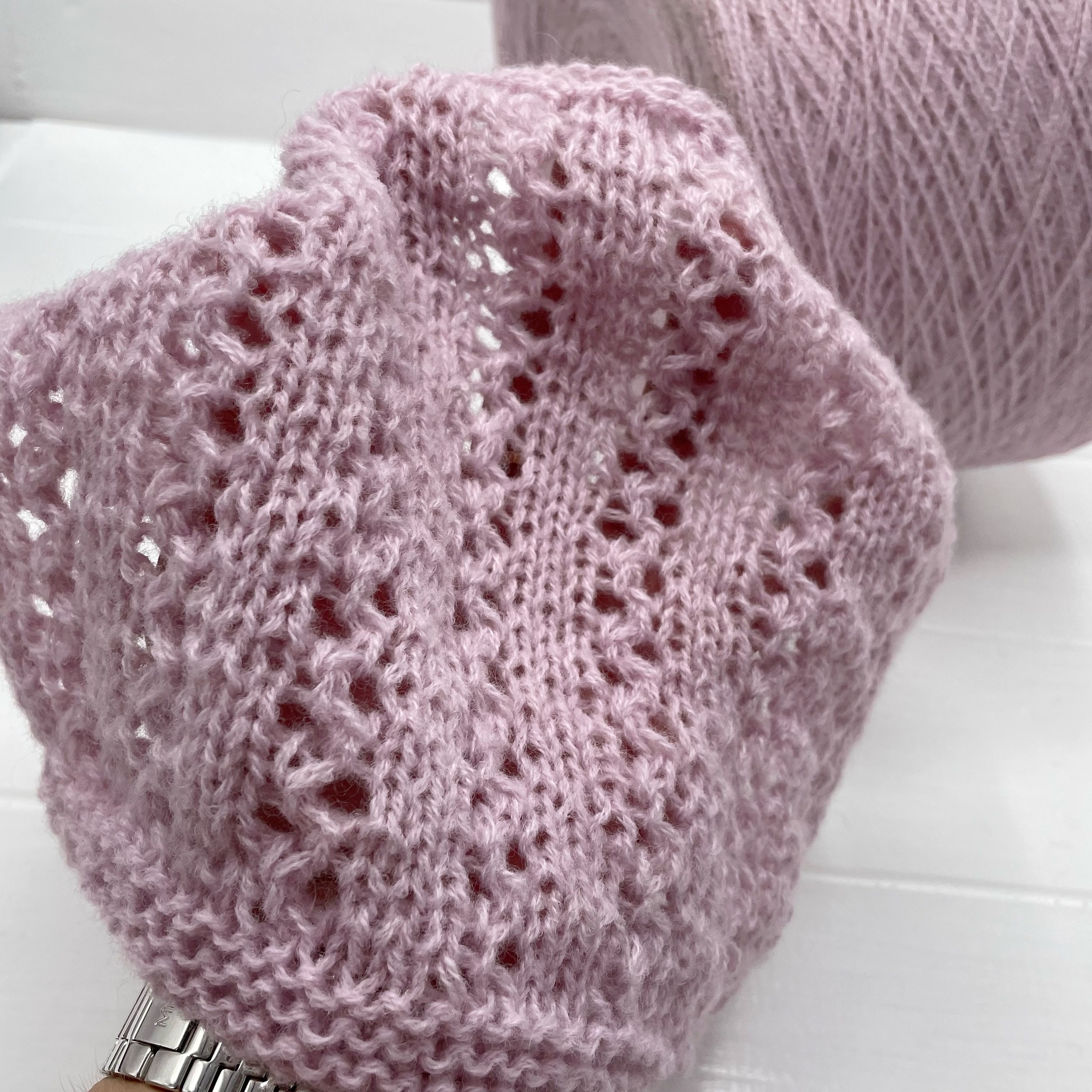 Нежнейший меринос. Нить имеет пористую структуру и немного вспушена, за счет чего она очень легкая и расход на изделие будет минимальный. На простой свитер 46 размера лицевой гладью в две нити примерно 300-400 гр. Образец связан на спицах 3,5 мм в две нити